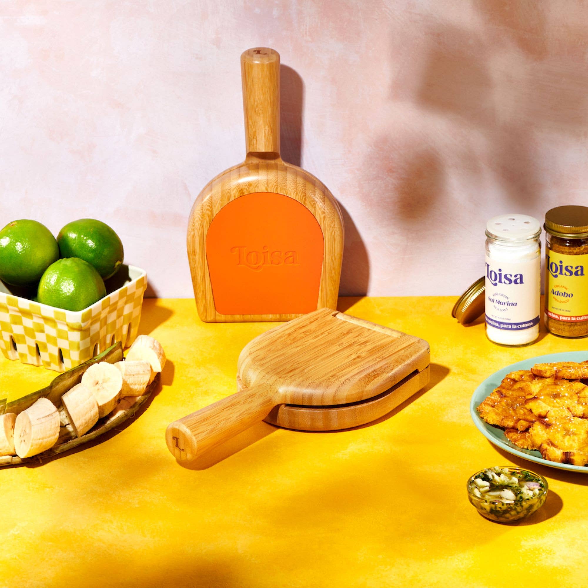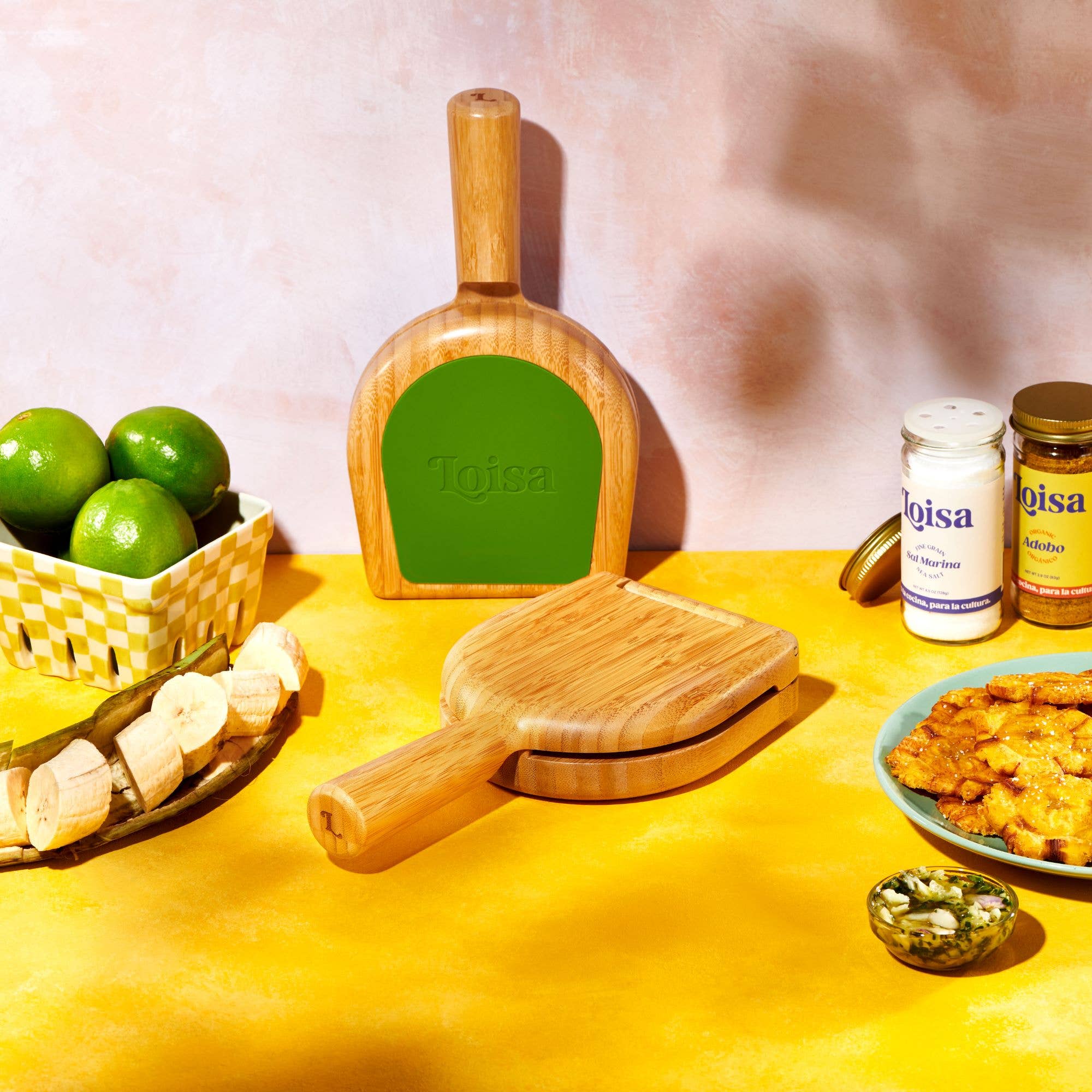 We designed a tostonera to match our love for tostones. Made with smooth interlocking hinges for long-lasting durability, rounded edges for comfort, and a colorful silicone base to stop slippage, this tool brings joy to our cocina with every smash.