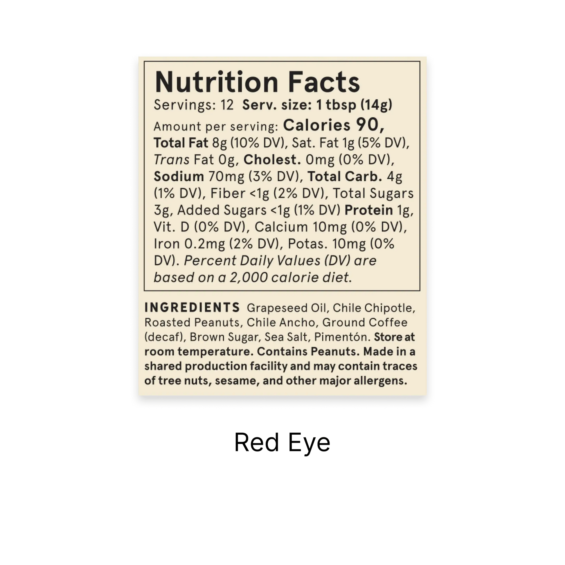 Red Eye (Chipotle + Coffee + Peanut): A fiery, fan-favorite blend of chipotle chiles, peanuts, and (decaf) coffee with multiple dimensions of flavor — smokiness, a hint of bitterness, nuttiness — and very satisfying heat.